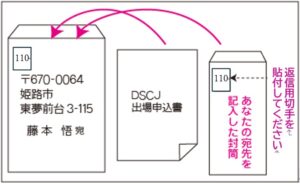 | ③ | シラバスに従い、ネットエントリーされるか、またはJDSF競技会出場申込書 に記入したものと、110円切手を貼付けた封筒に、あなたの宛先を記入したものを同封の上、郵送してください。 (ただし、ネット上で選手受付表等の確認ができる方は返信用封筒不要です) |